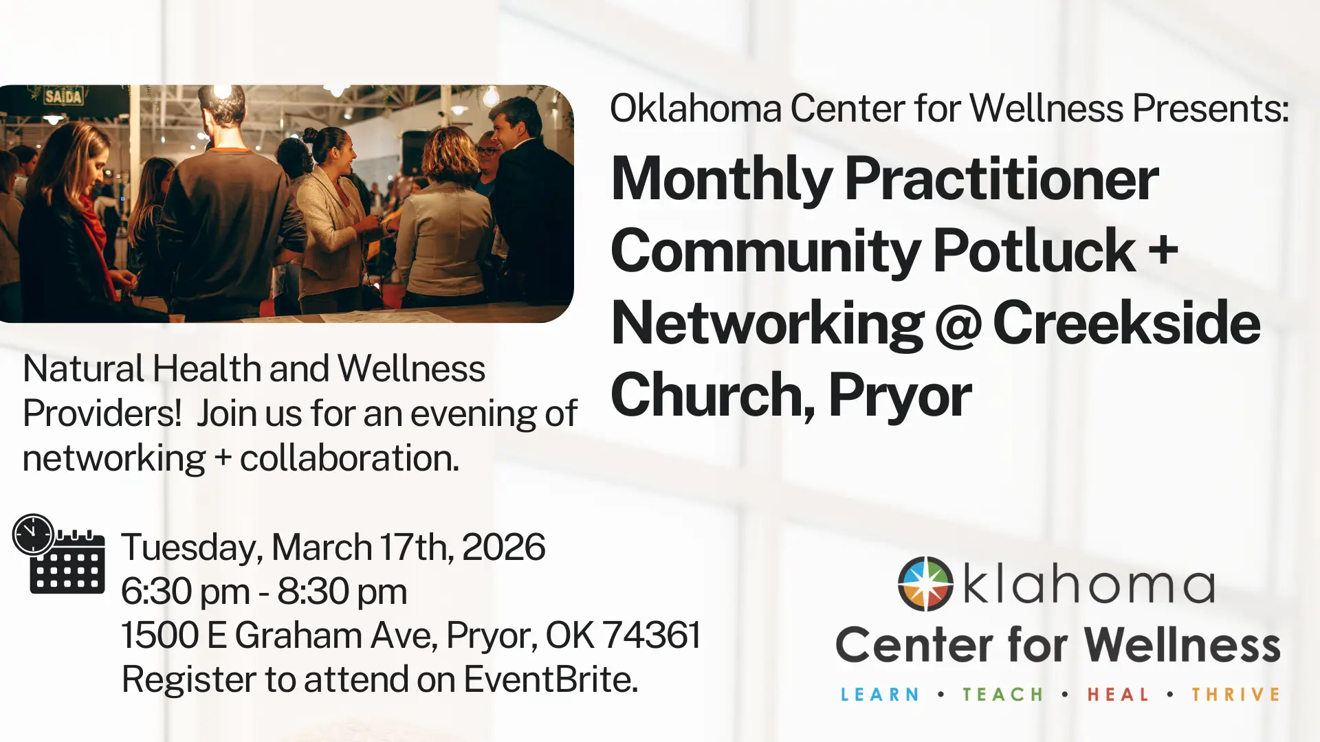 Creekside Church 1500 East Graham Avenue, PryorFor Natural Health Professionals, Holistic Practitioners, Students, and those interested in this as a profession! Join us for our monthly community collab! This month's host is Creekside Church in Pryor. 1500 E Graham Ave, Pryor, OK 74361 We start at 6:30 pm with a presentation about Oklahoma Center for Wellness and our vision to build […]